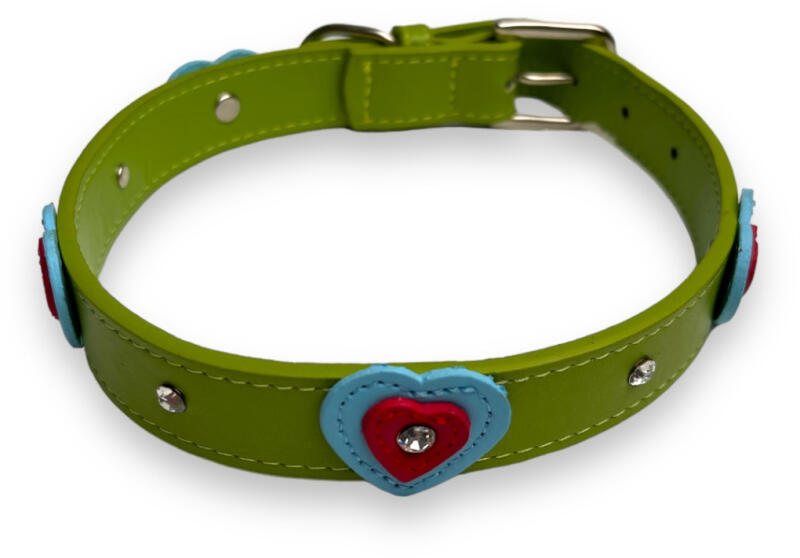 Színes, szívmintás nyakörv csillogó díszekkel kisállatok részére. Ez a vidám és divatos nyakörv tökéletes választás minden kiskedvenc számára, akiknek nemcsak a kényelem, hanem a stílus is fontos! A nyakörv élénk színárnyalatokban pompázik, szív alakú díszítéssel, valamint csillogó strasszkövekkel, amelyek még különlegesebbé teszik kedvenced megjelenését. A n