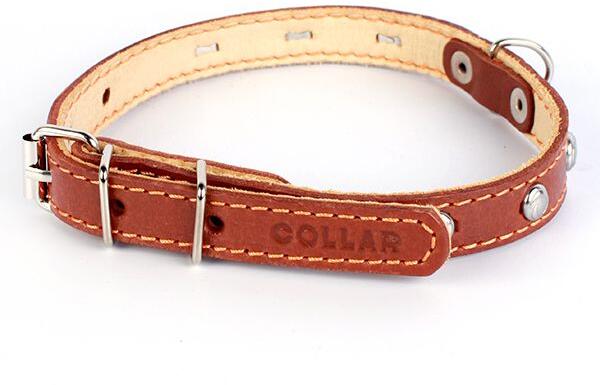 Barna bőr nyakörv fém dekorációval, hossza 27 - 35 cm és 14mm vastag. Kézzel varrt, kárpítozott és elegáns nyakörv fém dísszel. Jó minőségű bőrből készült. Nyak kerülete: 27 - 35cm Vastagsága: 14 mm