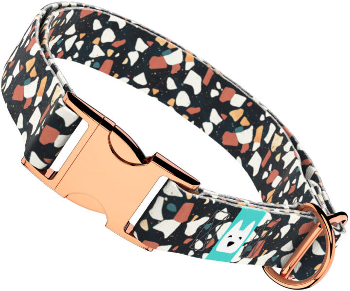 Terrazzo mintás nyakörv kutyádnak különböző méretekben. Öltöztesd kedvenced hazai gyártású egyedi nyakörvünkbe, amit kérhettek trendi rose gold, mindig elegáns ezüst fém alkatrészekkel vagy könnyű műanyag csattal. Ahhoz, hogy ezeket a különleges mintákat meg tudjuk alkotni, műhelyünkben nyomtatjuk a hevedert. Minden terméket csak igény esetén gyártunk le, így elker