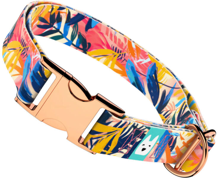 Színes trópusi levél mintás nyakörv kutyádnak különböző méretekben. Öltöztesd kedvenced hazai gyártású egyedi nyakörvünkbe, amit kérhettek trendi rose gold, mindig elegáns ezüst fém alkatrészekkel vagy könnyű műanyag csattal. Ahhoz, hogy ezeket a különleges mintákat meg tudjuk alkotni, műhelyünkben nyomtatjuk a hevedert. Minden terméket csak igény esetén gyártunk