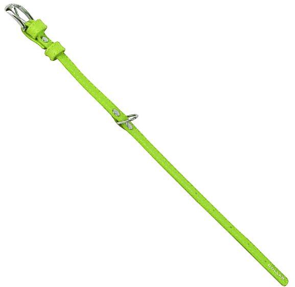 Zöld bőr nyakörv kistestű kutyafajok számára, hossza 21-29cm és szélessége 12mm. Kiváló minőségű, speciálisan festett bőrből készült puha nyakörv, amely nem hagy nyomot a kutya szőrén. Nyakkerület: 21 - 29 cm Széllesség: 12 mm