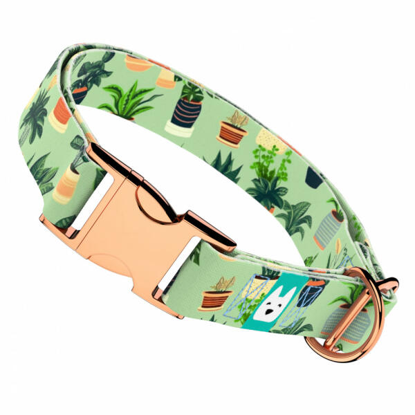 Dísznövény mintás nyakörv kutyádnak különböző méretekben. Öltöztesd kedvenced hazai gyártású egyedi nyakörvünkbe, amit kérhettek trendi rose gold, mindig elegáns ezüst fém alkatrészekkel vagy könnyű műanyag csattal. Ahhoz, hogy ezeket a különleges mintákat meg tudjuk alkotni, műhelyünkben nyomtatjuk a hevedert. Minden terméket csak igény esetén gyártunk le, így