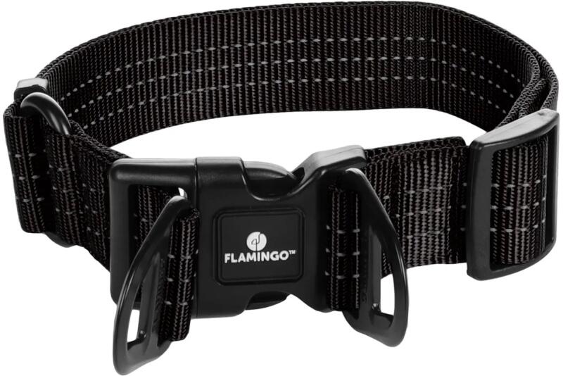 Jellemzők: - Anyag: nejlon - Folyamatosan állítható - Kattintós csat - Fém gyűrűk matt fekete kivitelben - Fényvisszaverő csíkok - 2 gyűrűvel a zárra nehezedő nyomás csökkentése érdekében Méretek: - S30-45cm x 25mm x 2mm - M40-55cm x 32mm x 3mm - L45-65cm x 32mm x 3mm - XL55-75cm x 38mm x 3mm