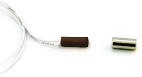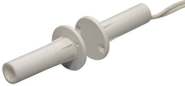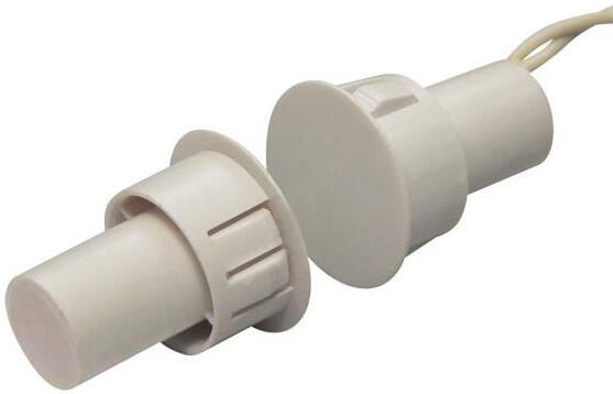 Befúrható, fémajtóhoz, 20x20mm, vezetékes, fehér. - Befúrható. - Nagy mágnesének köszönhetően kiválóan alkalmas nagyobb fémajtókhoz. - NC kontaktust adó Reed-relé. - Fehér és barna színben. - Kontaktus terhelhetősége: 30 Vdc, 0,5 A. - Vezetékhossz: 50 cm. - Átmérő: 20 mm. - Mélység: 20 mm.