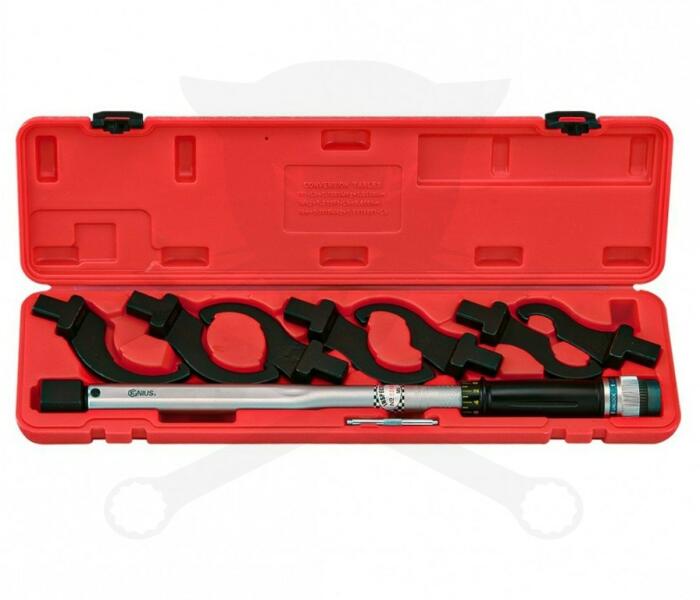 Genius Tools - Canada Műanyag kofferben szállított cserélhető fejű, erős nyomatékkulcs körmös fejjel kiegészítve. 8 darabos készlet kiszerelésben Tulajdonságok: Fejek befogása: téglalap 14x18 mm Skálás nyomatékválasztó Pontosság: ±1% Mértékegység választás: Nm - Ft. lb. - Nyomatékkulcs nyomaték skálával, cserélhető fejjel - 7 db körmöskulcs; méret: 32, 43, 50,