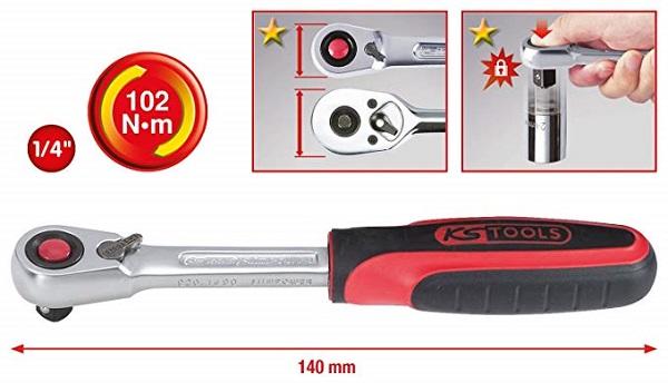 Billenőfejes racsni Csúszásmentes, ergonómikus műanyag nyél Króm–molibdén–acél racsniszerkezet Fekete, foszfátozott fej Fényezett, polírozott felületkezelés Gyorsoldású Egyenes szár Törés garancia