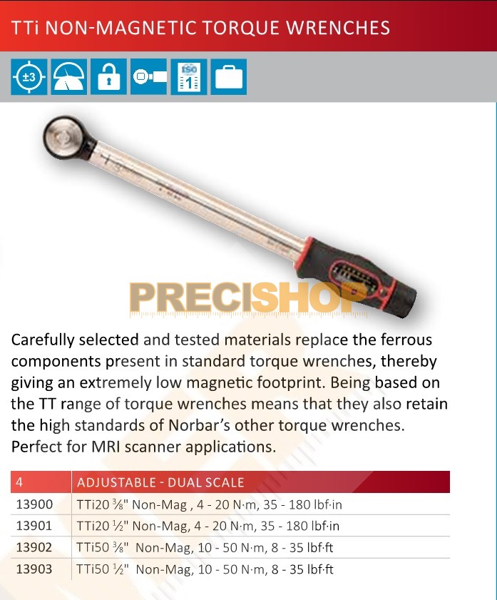A beállított nyomaték elérésekor a kulcs karja egyértelműen kattan, visszahúzása után újra meghúzásra kész. nem mágneses, NON-Magnetic, Jó minőségű anyagokból készül. Angol kivitel. Jó minőségű anyagokból készül, ipari felhasználásra. Angol kivitel.