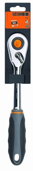 NEO 245 mm hosszú, ½-os racsnis hajtókar a DIN 3122 szabványnak megfelelően kivitelezett króm-vanádium acél testtel. A 48 fogas kilincsmű a szerszám élettartamát meghosszabbító, kivételesen tartós króm-molibdén acélból készült. Az ergonómikus bimateriál markolat javítja a használati kényelmet. A szerszám minőségét bizonyítja a TÜV tanúsítvány és a gyártó ált