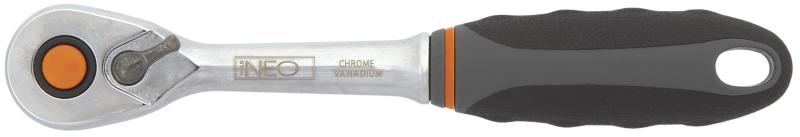 NEO 195 mm hosszú, ⅜-os racsnis hajtókar a DIN 3122 szabványnak megfelelően kivitelezett króm-vanádium acél testtel. A 48 fogas kilincsmű a szerszám élettartamát meghosszabbító, kivételesen tartós króm-molibdén acélból készült. Az ergonómikus bimateriál markolat javítja a használati kényelmet. A szerszám minőségét bizonyítja a TÜV tanúsítvány és a gyártó ál