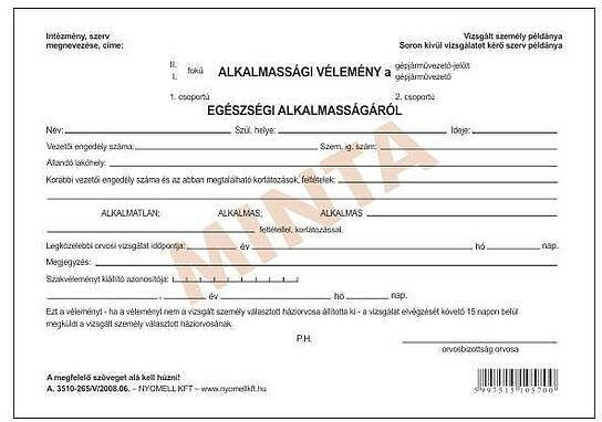 Orvosi vélemény a gépjárművezetői alkalmasságról. - A5-ös méret - 2 lapos garnitúra