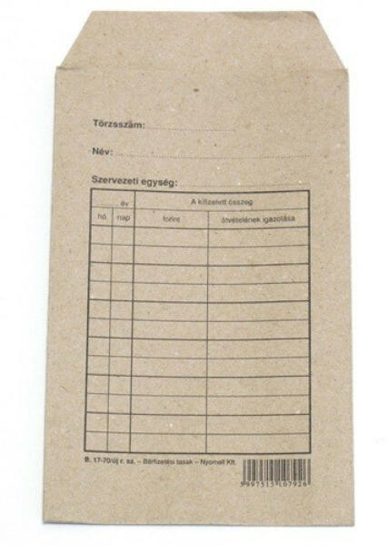 Bérfizetési tasak: 110x190 mm. A termék paraméterei: - Termékazonosító szám: B. 17-70. - Mennyiségi egység: darab. Katalóguskód: 14505