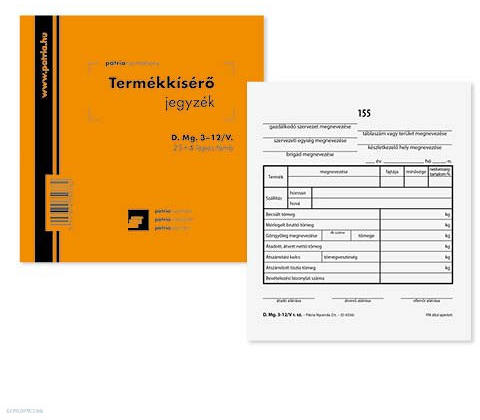 Termékkísérő jegyzék Mérete: 140 x 140 mm 25 x 4 lapos Adatai: Termék megnevezése, fajtája, minősége, nedvességtartalom % Szállítás honnan, hová Becsült tömeg Mérlegelt bruttó tömeg Göngyöleg megnevezése: db száma, tömege Átadott, átvette nettó tömeg Átszámítási kulcs, tömegveszteség Átszámított tiszta tömeg Bevételi bizonylat száma .