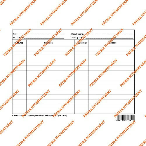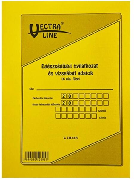 Egészségügyi nyilatkozat és vizsgálati adatok. B/5 méretű, álló, 16 lapos. Minőségi belívvel, karton fedlappal rendelkező nyomtatvány. Tartós tűzött kötéssel és perforációval rendelkezik. Kiszerelés: 200 db/csomag. Gyűjtő: 25 db.