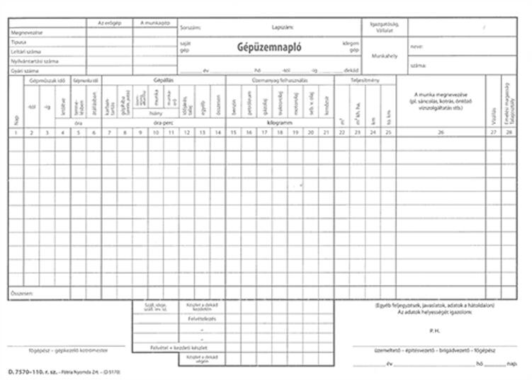 Gépüzemnapló. A/4 méretű, fekvő, 25 lapos, 3 példányos. Minőségi belív, karton fedlap. Kiszerelés: