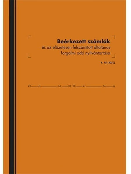 B. 15-30/UJ 50lapos 3 "Áfás beérkezett számlák és Áfa nyilván tartó" nyomtatvány - Beérkezett számlák nyilvántartása B. 15-30 - 50 lapos füzet - Termék kód: C. 3151-2/A - Méret: A/4, álló - A borító színe változhat!