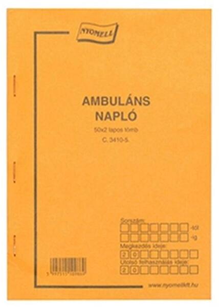 Ambuláns napló. A/5 méretű, álló, 50 lapos, 2 példányos. Minőségi belív, karton fedlap. Kiszerelés: 20 db/csomag.