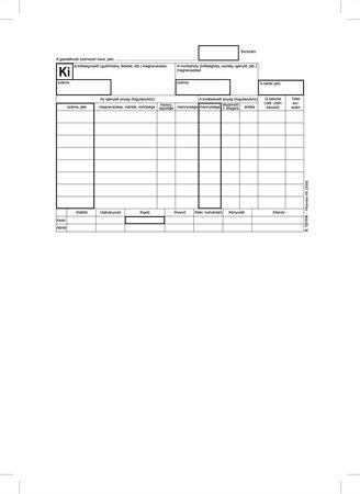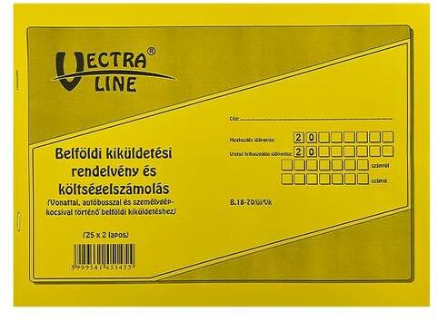 Kiküldetési rendelvény és költségszámolás. A/4 méretű, fekvő, 25 lapos, 2 példányos. Minőségi belívvel, karton fedlappal rendelkező nyomtatvány. Tartós tűzött kötéssel és perforációval rendelkezik.