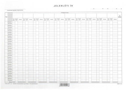 Nyomtatvány jelenléti ív A/3 havi Jelenléti ív, havi. A/3 méretű, fekvő, 2 oldalas, 10 fő. Kiszerelés: 100 db/csomag.
