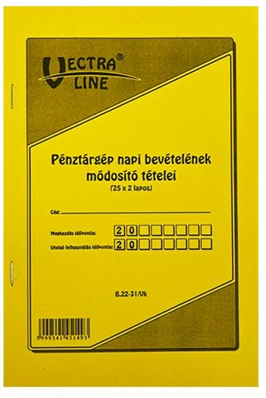 Pénztárgép napi bevételének módosító tételei. A/5 méretű, álló, 25 lapos, 2 példányos. Minőségi belívvel, karton fedlappal rendelkező nyomtatvány. Tartós tűzött kötéssel és perforációval rendelkezik. Kiszerelés: 40 db/csomag.