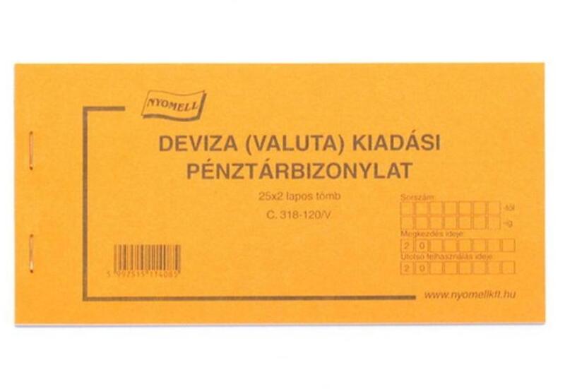 Deviza kiadási bizonylat. Fekvő, 25 lapos, 2 példányos. Minőségi belív, karton fedlap. Tartós tűzés, kiváló átírási képesség és perforáció.