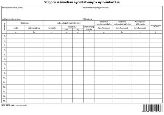 Szigorú számadású nyomt. beszerzésének nyilvántartása tömb. Méret: A/4. Formátum: fekvő. Lapszám: 25. Kiszerelés: 25 lap/tömb.