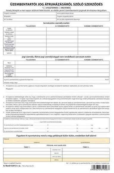 - Üzembentartói jog átruházásáról szóló szerződés 4 lapos garnitúra; - Formátum: A/4 álló; - A. REND. 4/2012