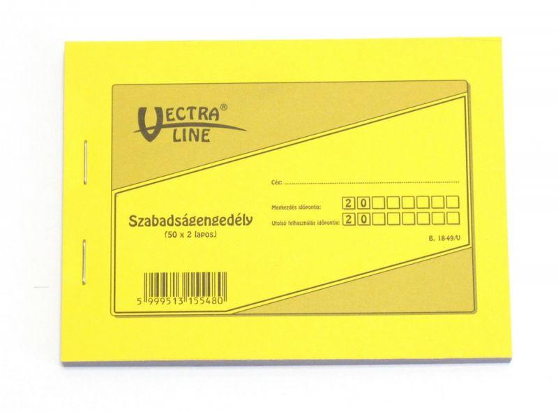 Szabadságengedély. A/6 méretű, fekvõ, 50 lapos, 2 példányos. Minõségi belívvel, karton fedlappal rendelkezõ nyomtatvány. Tartós tűzött kötéssel és perforációval rendelkezik. Kiszerelés: 20 db/csomag.