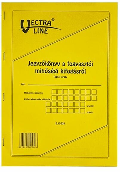 Jegyzõkönyv a fogyasztó minõségi kifogásról. VECTRA-LINE. A/4 méretű, álló formátumú, 25 lapos, 3 példányos. Minõségi belívvel, karton fedlappal rendelkezõ nyomtatvány. Tartós tűzött kötéssel, kiváló átírási képességgel és perforációval rendelkezik.