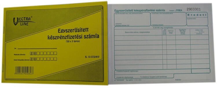 Nyomtatvány készpénzfizetési számlatömb VECTRALINE 50x3 fekvő 1 áfás Készpénzfizetési számlatömb. VECTRA-LINE. A/5 méretű, fekvő formátumú, 50 lapos, 3 példányos, 1 áfás. Minőségi belívvel, karton fedlappal rendelkező nyomtatvány. Tartós tűzött kötéssel, kiváló átírási képességgel és perforációval rendelkezik. Kiszerelés: 20 db/csomag. Minimális rendelh