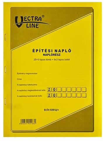 Építési napló. A/4 méretű, álló, 25 lapos, 3 példányos, pótlapos. Minőségi belívvel, karton fedlappal rendelkező nyomtatvány. Tartós tűzött kötéssel és perforációval rendelkezik. Kiszerelés: 20 db/csomag.