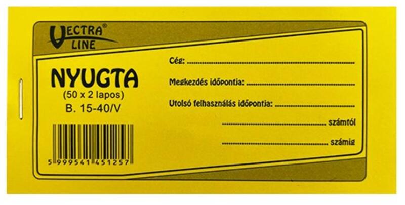 Nyugta. 140x75mm méretű, fekvő, 50 lapos, 2 példányos 1 soros. Minőségi belívvel, karton fedlappal rendelkező nyomtatvány. Tartós tűzött kötéssel és perforációval rendelkezik. Kiszerelés: 20 db/csomag. Szigorú számadású nyomtatvány.