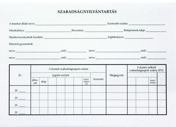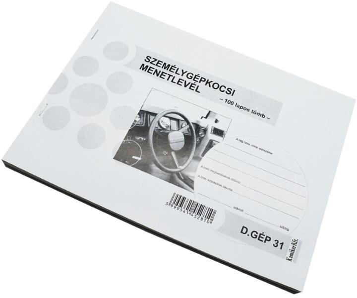 Felhasználási terület: Céges tulajdonban lévő személygépkocsik, amelyek kizárólagosan céges használatra szolgálnak(!!) menetlevele. 100 lapos tűzött tömb, A/4, fekvő, rövidebb oldalán tűzve, karton borítás, 70 g/m2 ofszet belívek. Katalóguskód: 4216