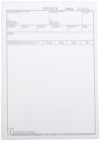 Deviza számla, angol. A/4 méretű, álló, 5 példányos, 2007 angol. Kiszerelés: 200 ív/csomag. Szigorú számadású nyomtatvány.