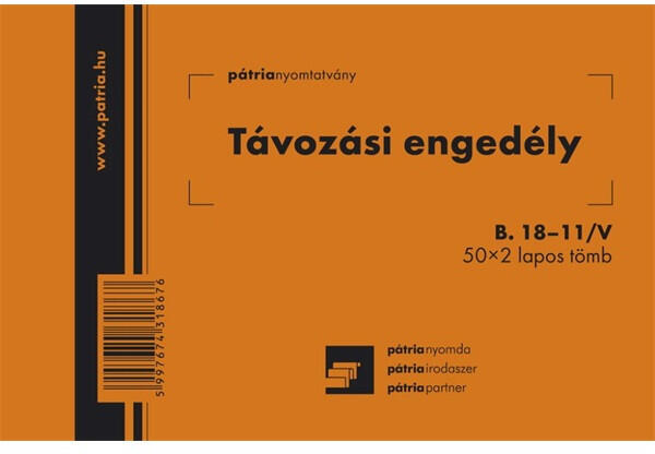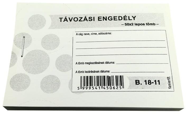 B. 18-11/V 105x70mm 50x2lap "Távozási engedély" nyomtatvány