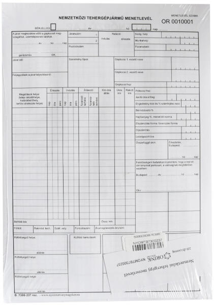 NEMZETKÖZI TEHERGÉPJÁRMŰ MENETLEVÉL SZABADLAP A3 MÉRET B. 7300-237 200 ív/ csomag Katalóguskód: 14517