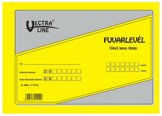 Nyomtatvány fuvarlevél VECTRALINE 50x3 Fuvarlevél. A/4 méretű, fekvő, 50 lapos, 3 példányos. Vegykezelt. Minőségi belívvel, karton fedlappal rendelkező nyomtatvány. Tartós tűzött kötéssel és perforációval rendelkezik. Kiszerelés: 10 db/csomag.
