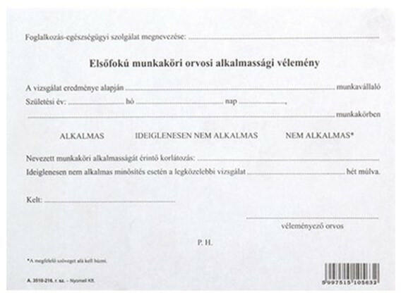 Nyomtatvány elsőfokú munkaköri orvosi alkalmassági vélemény Elsőfokú munkaköri orvosi alkalmassági vélemény. A/5 méretű, fekvő,
