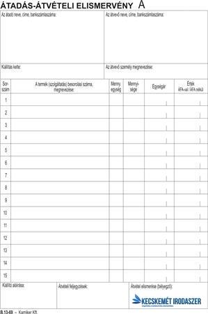 A/6 méretű 3 példányos, fekvő kivitelű, minőségi belívvel és karton fedlappal rendelkező nyomtatvány. Tartós tűzött kötéssel, kiváló átírási képességgel és perforációval. 50 lap/tömb. Kiszerelés: 20 tömb/csomag.