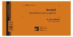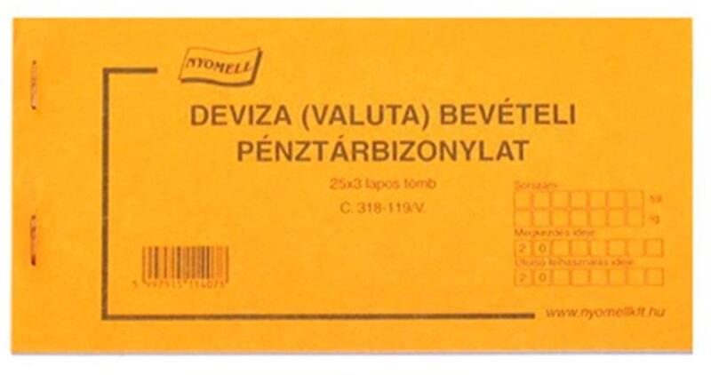 Deviza bevételi pénztárbizonylat. Mérete: 200x98 mm, fekvő, 25 lapos, 3 példányos. Minőségi belív, karton fedlap. Tartós tűzés, kiváló átírási képesség és perforáció. Kiszerelés: 20 tömb/csomag.