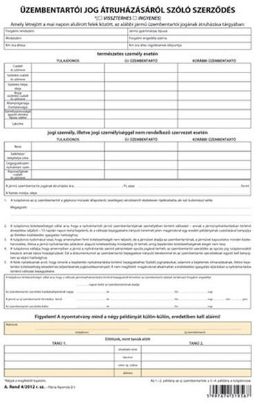 A. REND. 4/2012 A4 4lapos "Üzembentartói jog átruházásáról szóló szerződés" nyomtatvány - Üzembentartói jog átruházásáról szóló szerződés 4 lapos garnitúra - Formátum: A/4 álló - A. REND. 4/2012