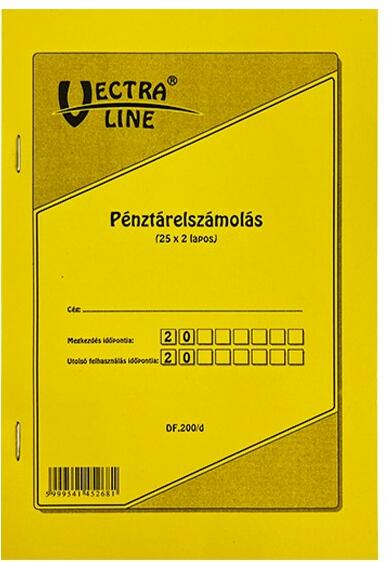 Pénztárelszámolás. A/5 méretű, álló, 25 lapos, 2 példányos. Minőségi belívvel, karton fedlappal rendelkező nyomtatvány. Tartós tűzött kötéssel és perforációval rendelkezik. Kiszerelés: 10 db/csomag.