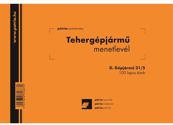 D. GEPJ. 21/5 A5 100lapos fekvő "Tehergépjármű menetlevél" nyomtatvány Tehergépjármű menetlevél, 100 lapos tömb - A/5 fekvő, D. GEPJ. 21/5