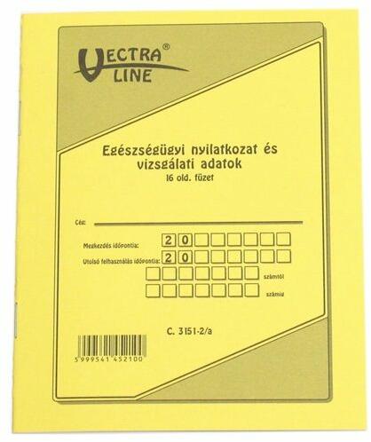 Egészségügyi nyilatkozat és vizsgálati adatok. B/5 méretű, álló, 16 lapos. Minõségi belívvel, karton fedlappal rendelkezõ nyomtatvány. Tartós tűzött kötéssel és perforációval rendelkezik. Kiszerelés: 200 db/csomag. Gyűjtõ: 25 db.