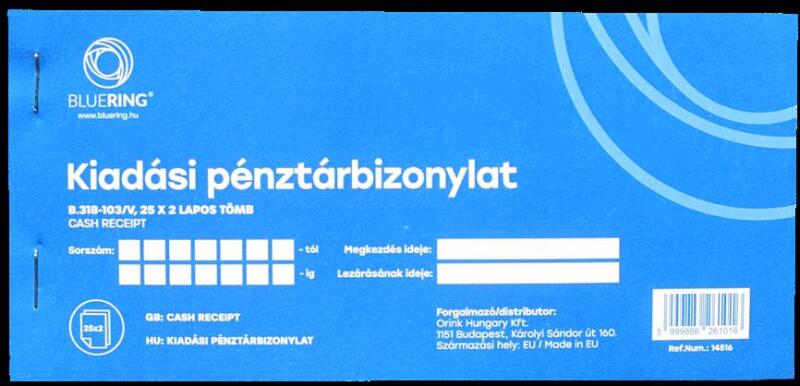 Kiadási pénztárbizonylat költségvetési szervek részére. Fekvõ, 25 lapos, 2 példányos. Minõségi belívvel, karton fedlappal rendelkezõ nyomtatvány. Tartós tűzött kötéssel és perforációval rendelkezik.