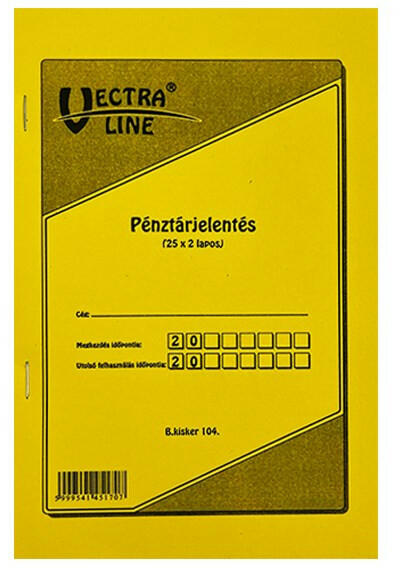 Nyomtatvány pénztárjelentés VECTRA-LINE A/5 25x2 lapos Pénztárjelentés. A/5 méretű, álló, 25 lapos, 2 példányos. Minőségi belívvel, karton fedlappal rendelkező nyomtatvány. Tartós tűzött kötéssel és perforációval rendelkezik.