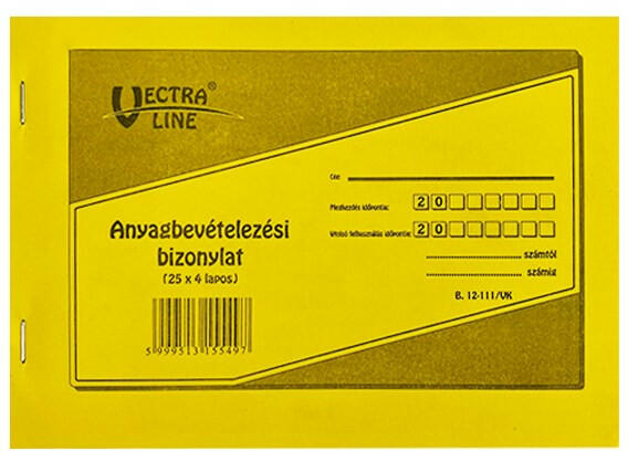 Nyomtatvány anyag bevét VECTRA-LINE 25x4 8 tételes Anyag bevét. VECTRA-LINE. A/5 méretű, fekvő formátumú, 25x4 lapos, 8 tételes. Minőségi belívvel, karton fedlappal rendelkező nyomtatvány. Tartós tűzött kötéssel, kiváló átírási képességgel és perforációval rendelkezik. Kiszerelés: 20 db/csomag.