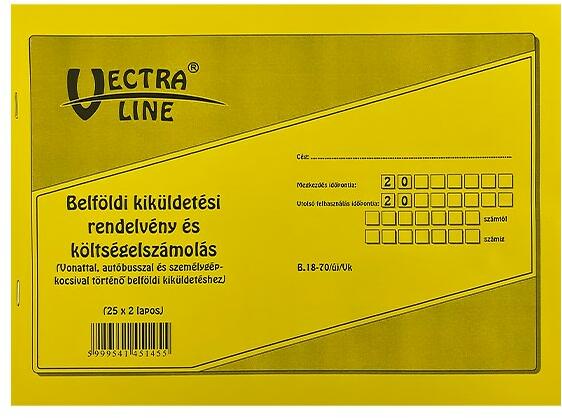 Kiküldetési rendelvény és költségszámolás. A/4 méretű, fekvő, 25 lapos, 2 példányos. Minőségi belívvel, karton fedlappal rendelkező nyomtatvány. Tartós tűzött kötéssel és perforációval rendelkezik.