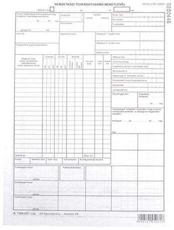 Nemzetközi tehergépkocsi menetlevél. A/4 méretű, álló. Kiszerelés: 100 db/csomag.