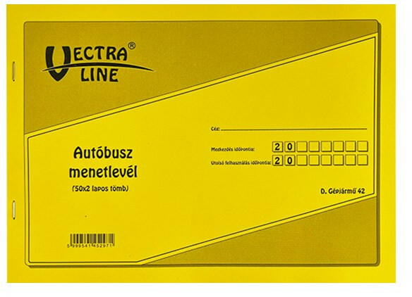 Nyomtatvány autóbusz menetlevél VECTRA-LINE A/4 50x2 Autóbusz menetlevél. A/4 méretű, fekvő, 50 lapos, 2 példányos. Minőségi belívvel, karton fedlappal rendelkező nyomtatvány. Tartós tűzött kötéssel és perforációval rendelkezik.
