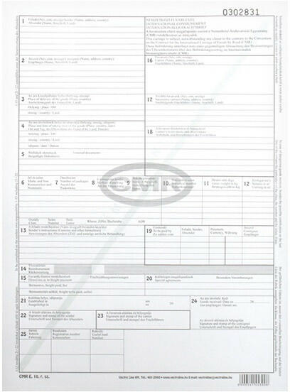Nyomtatvány fuvarlevél CMR 6 példányos Fuvarlevél. Nemzetközi. A/4 méretű, álló, 6 példányos. Minőségi belívvel, karton fedlappal rendelkező nyomtatvány. Tartós tűzött kötéssel és perforációval rendelkezik. Kiszerelés: 200 db/csomag. Minimálisan rendelhető: 100db.